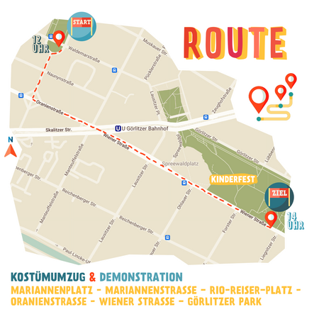 Der Kostüm-Umzug ist in diesem Jahr wieder eine Demonstration! Er startet um 12:00 Uhr mit einer Kundgebung am Mariannenplatz und führt dann ab 12:30 Uhr über die Oranienstraße bis in den Görlitzer Park.